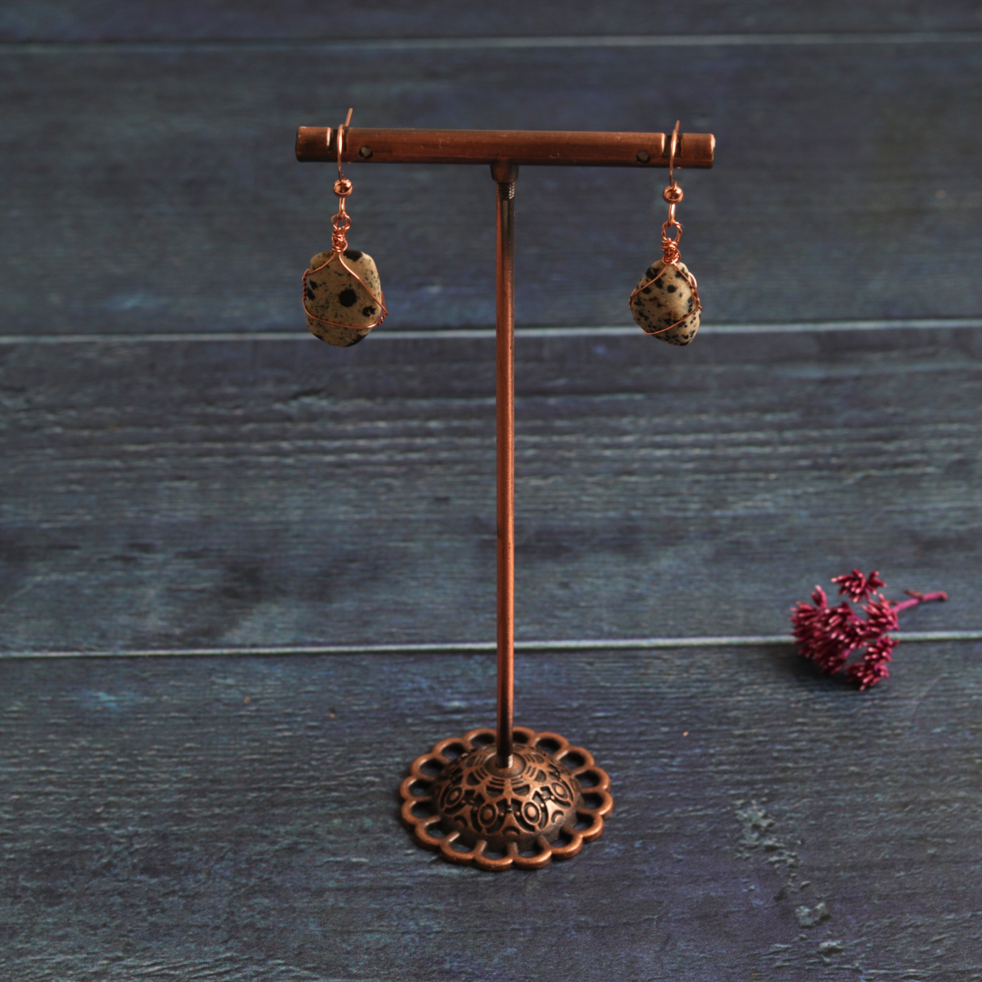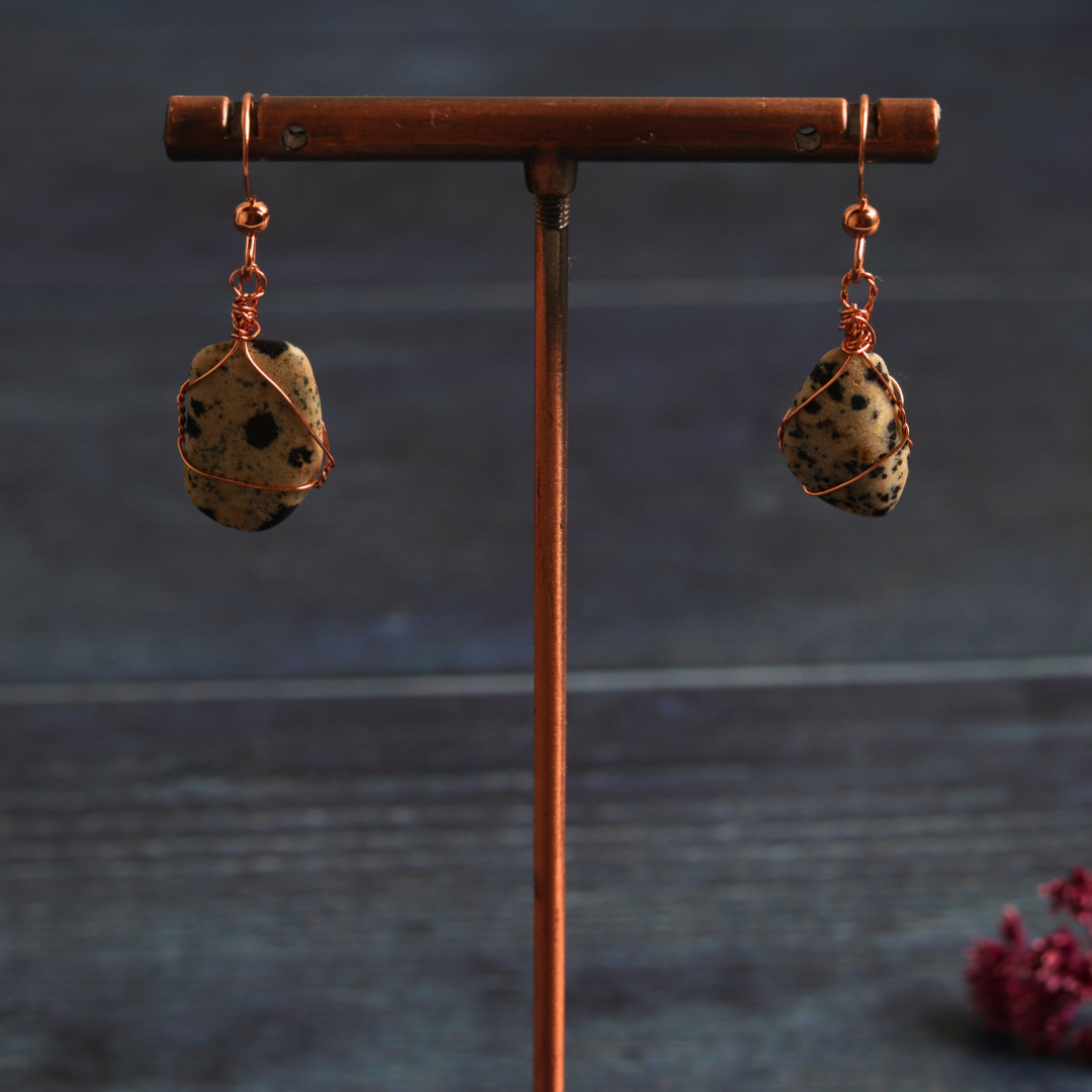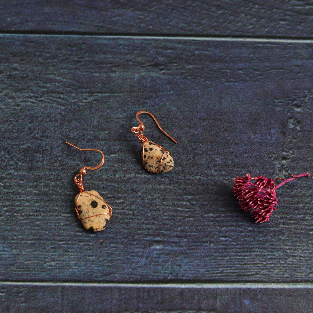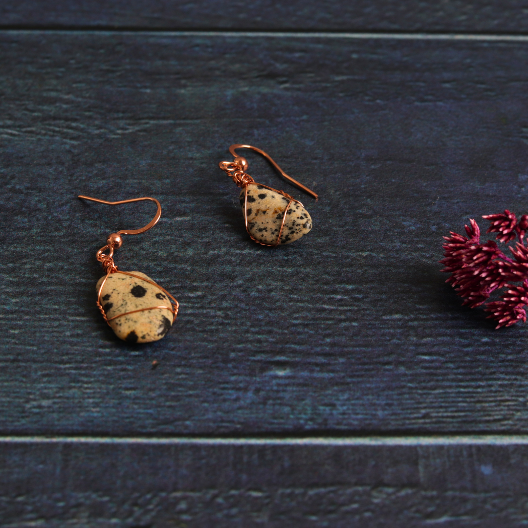 These handmade earrings feature Dalmatian jasper stones beautifully wrapped in rose gold. The combination offers a chic and eye-catching look, perfect for adding a touch of elegance to any outfit.