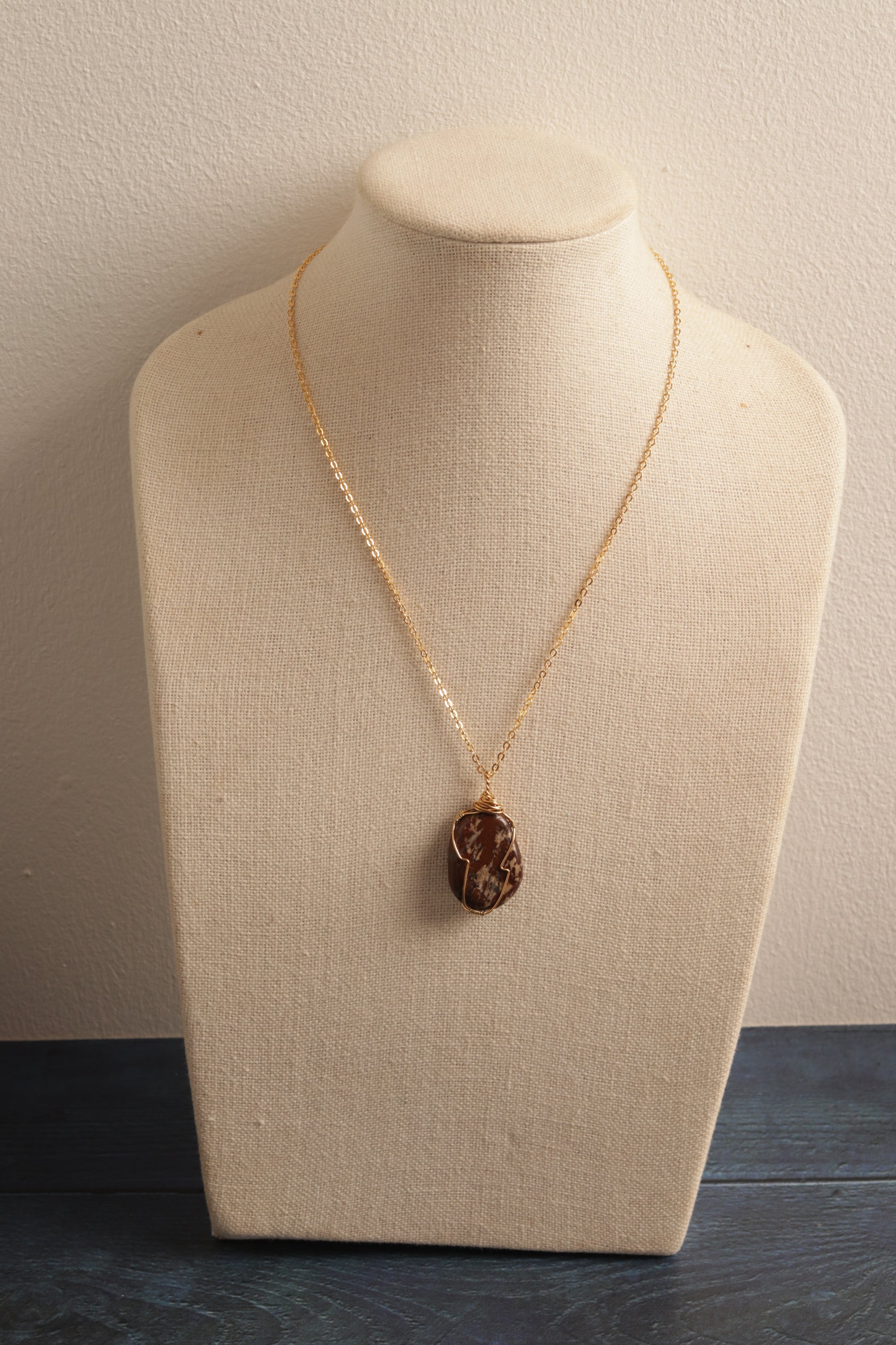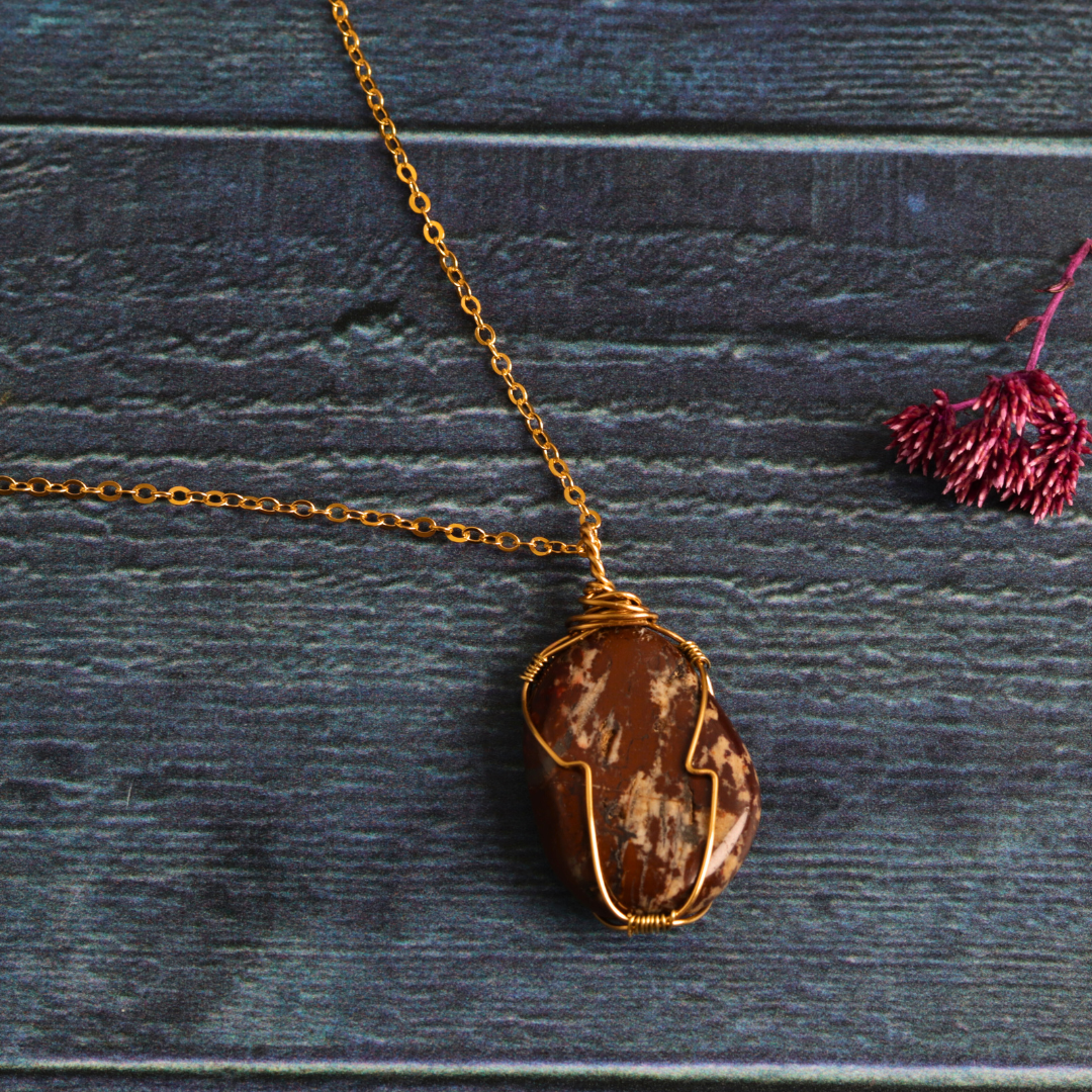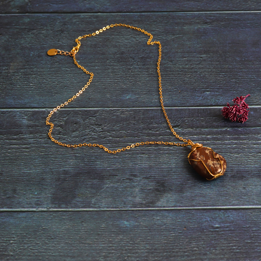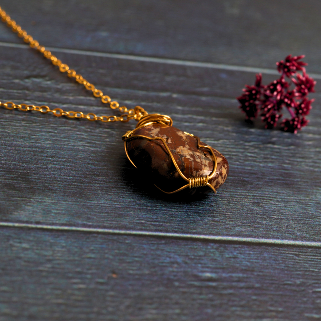 This classic handmade necklace features a beautiful jasper stone wrapped in gold-plated stainless steel. The warm tones of the jasper paired with the gold plating create a stunning look that's perfect for any occasion. Jasper is known for its grounding properties, promoting emotional stability and balance, which makes this piece not just stylish but also beneficial for your well-being.
