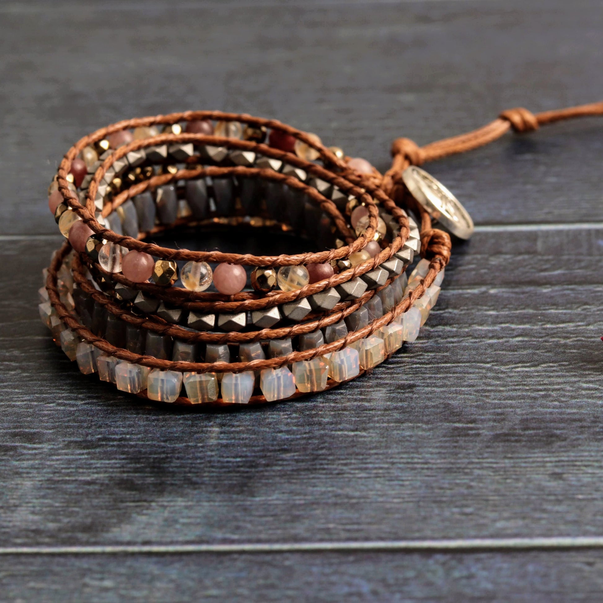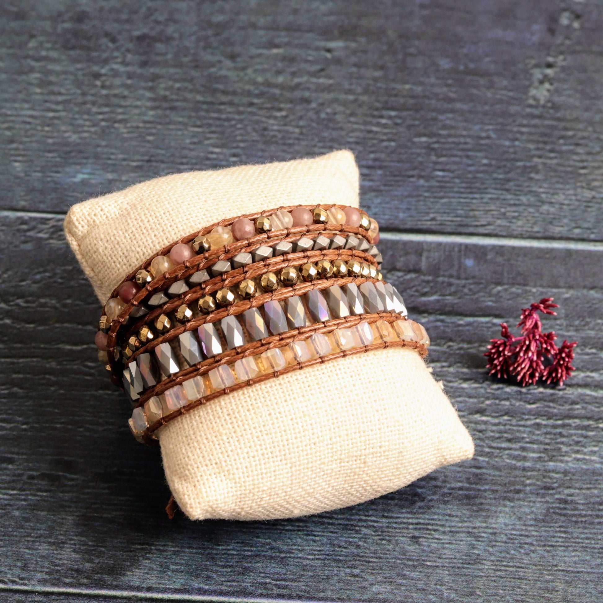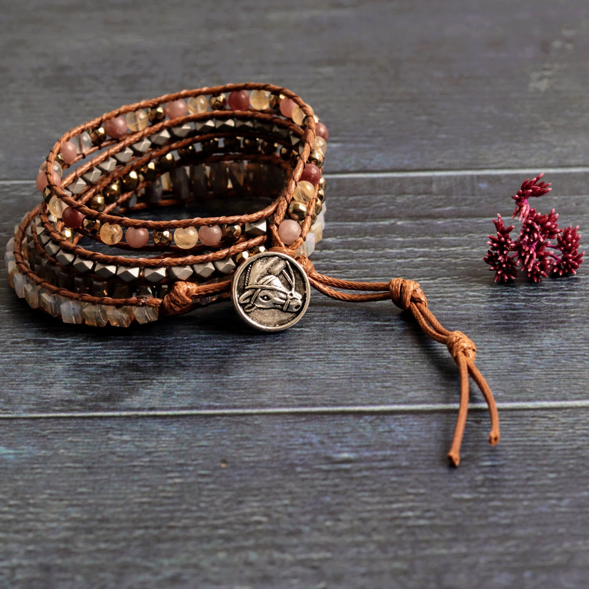 Celebrate balance with this exquisite wrap bracelet, showcasing Indian agate and glass beads and a woven fabric chord. Wrapping five times around your wrist, it’s more than just an accessory; it’s a symbol of affection and purpose.