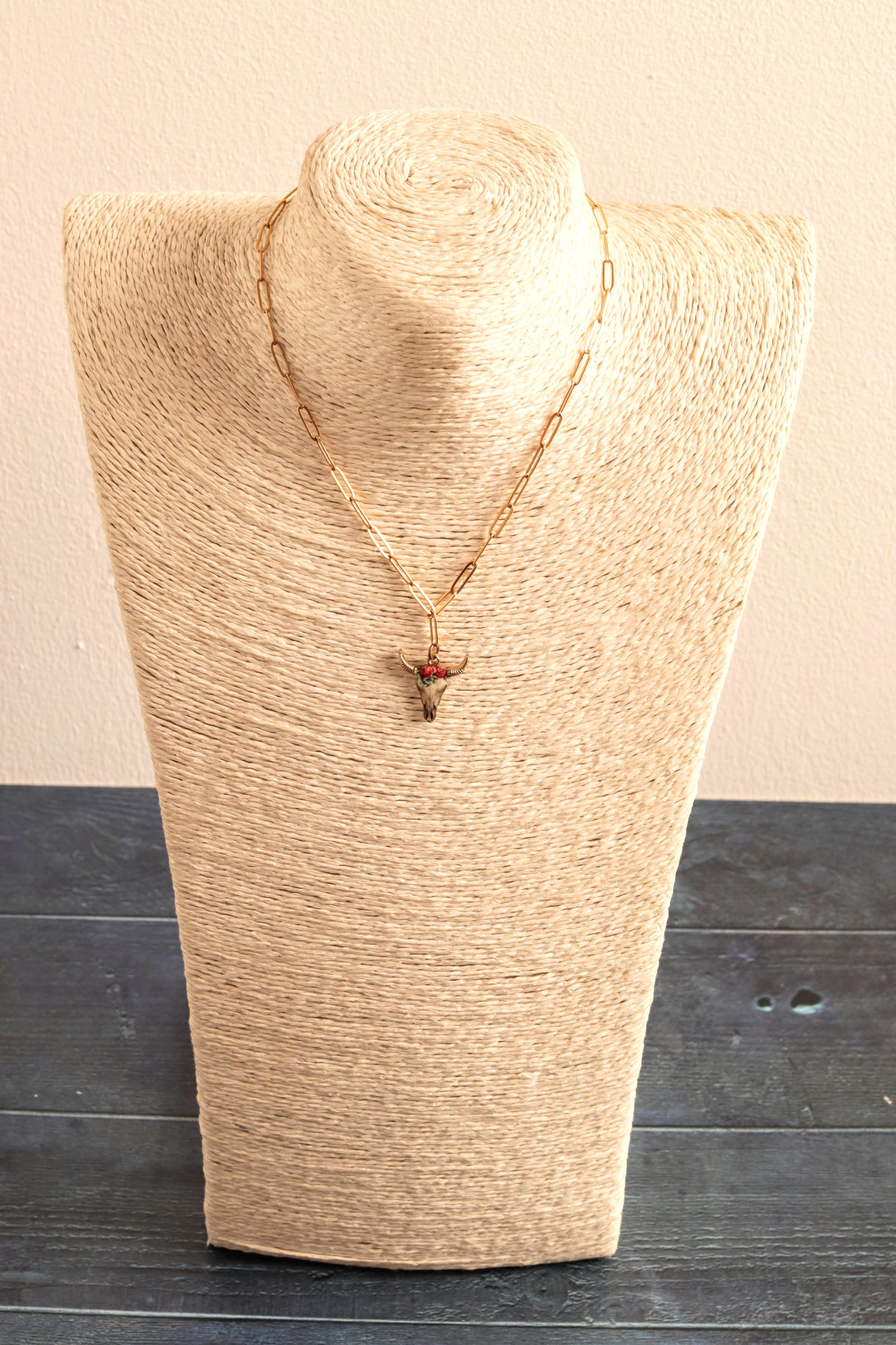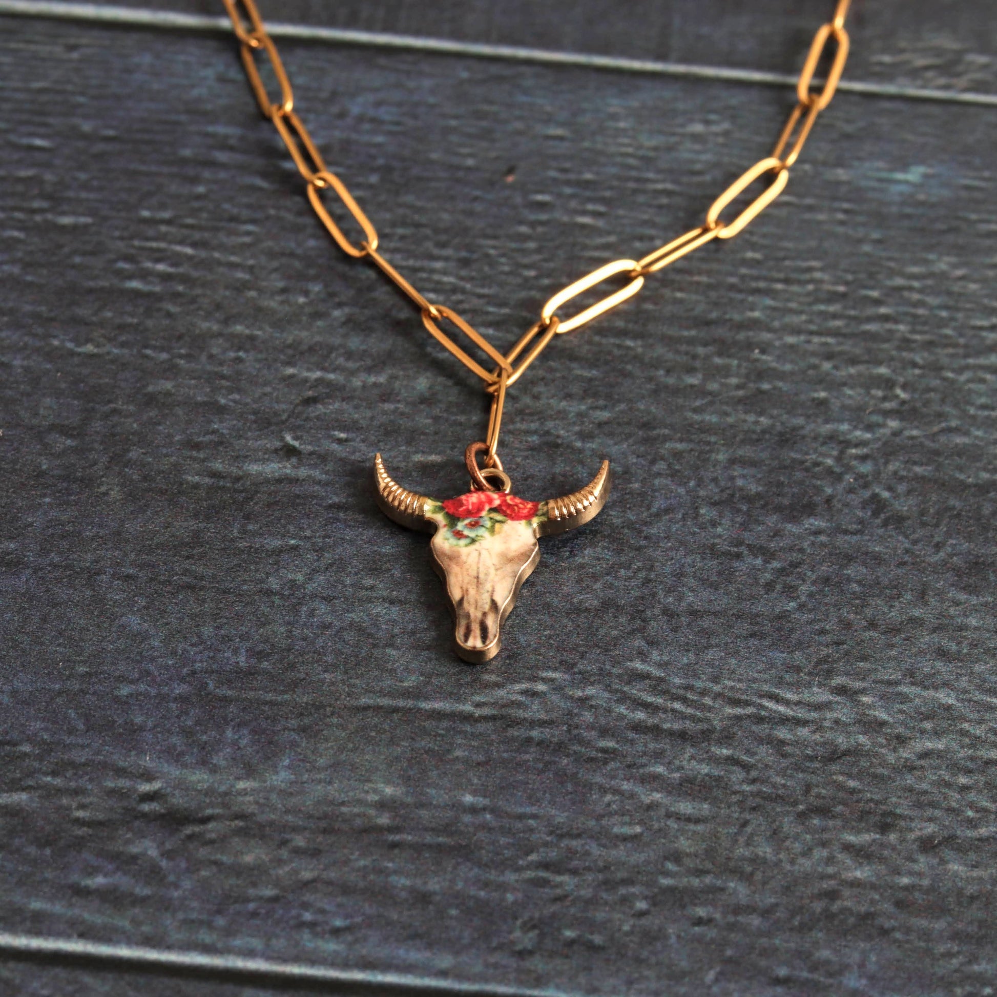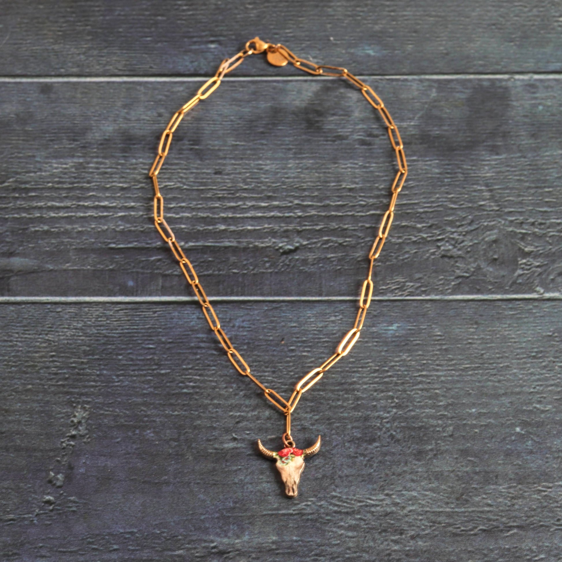 Our signature cow skull charm looks lovely on a gold toned stainless steel paperclip chain. Handmade by local artists.