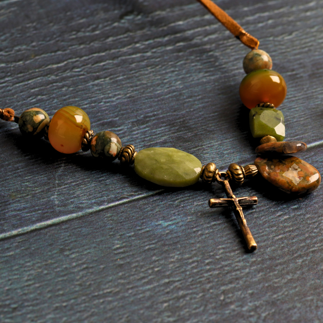 This handmade necklace features a leather chain and a cross charm made from alloy. It showcases a stunning blend of rainforest jasper, yellow agate, and jade, creating a truly unique design. Perfect for adding a distinctive touch to your style!