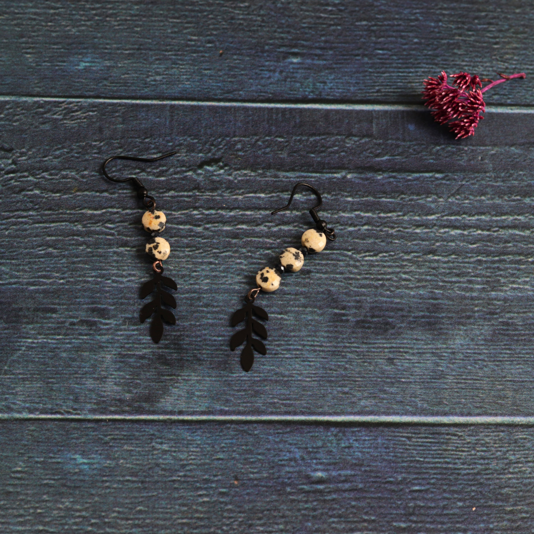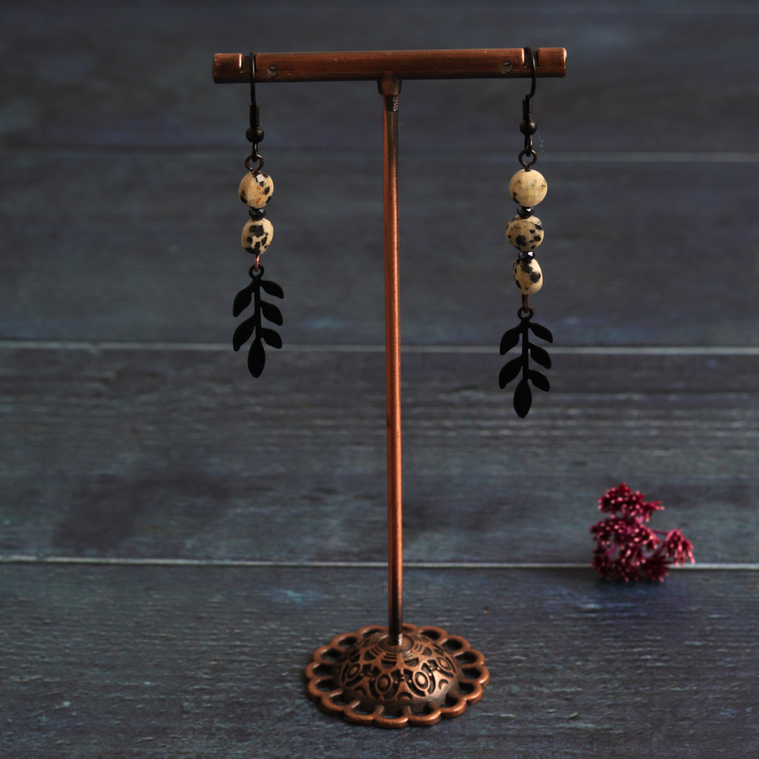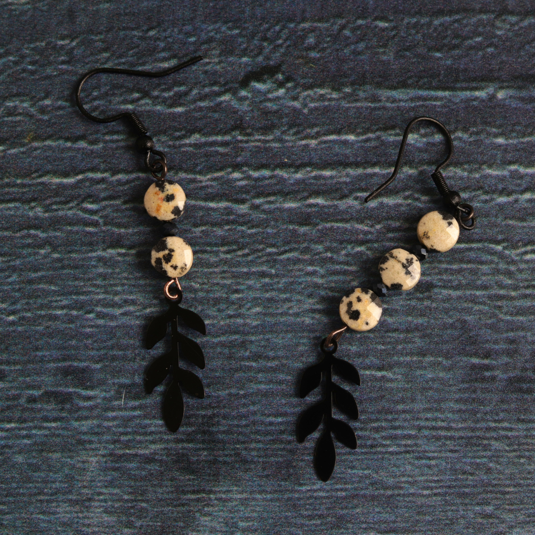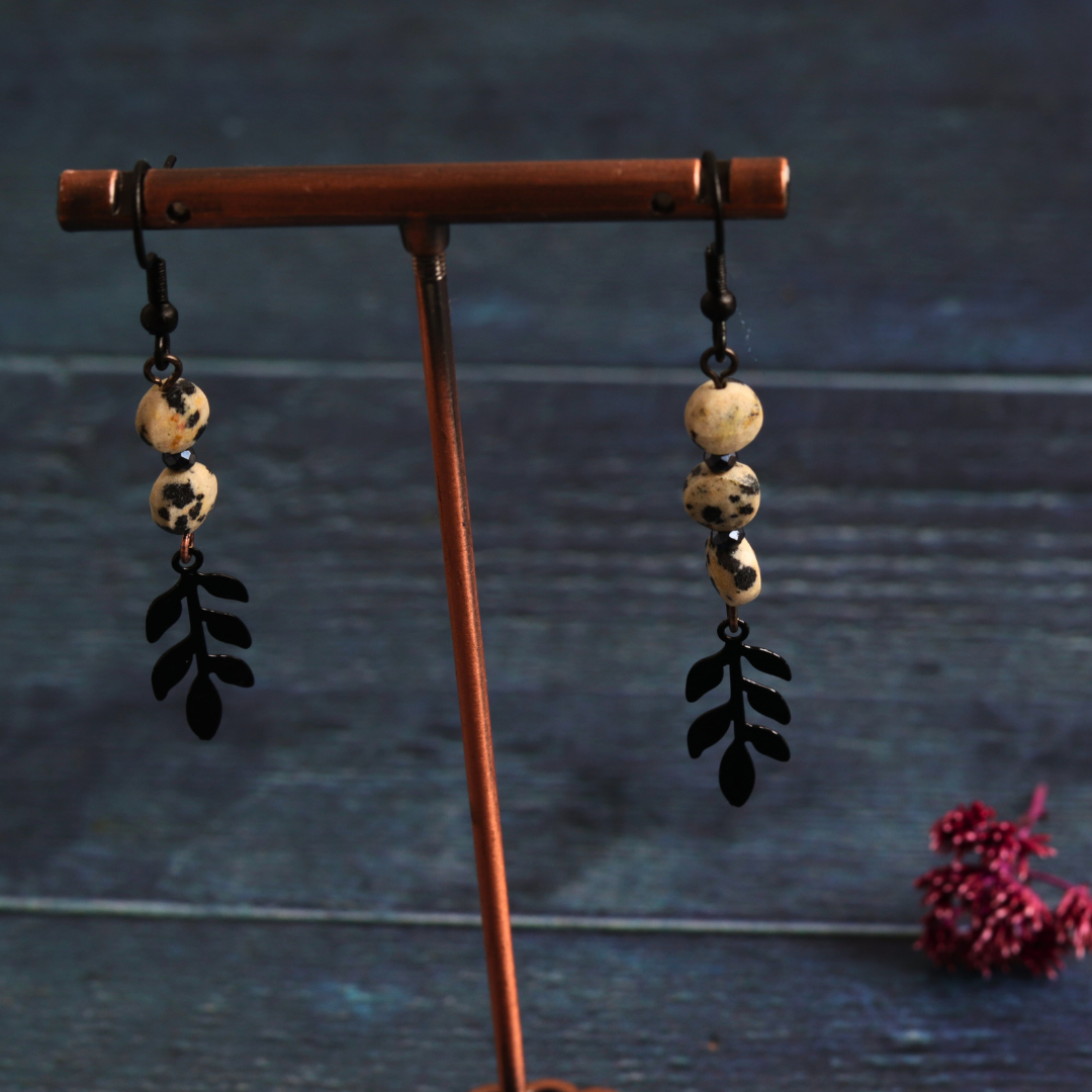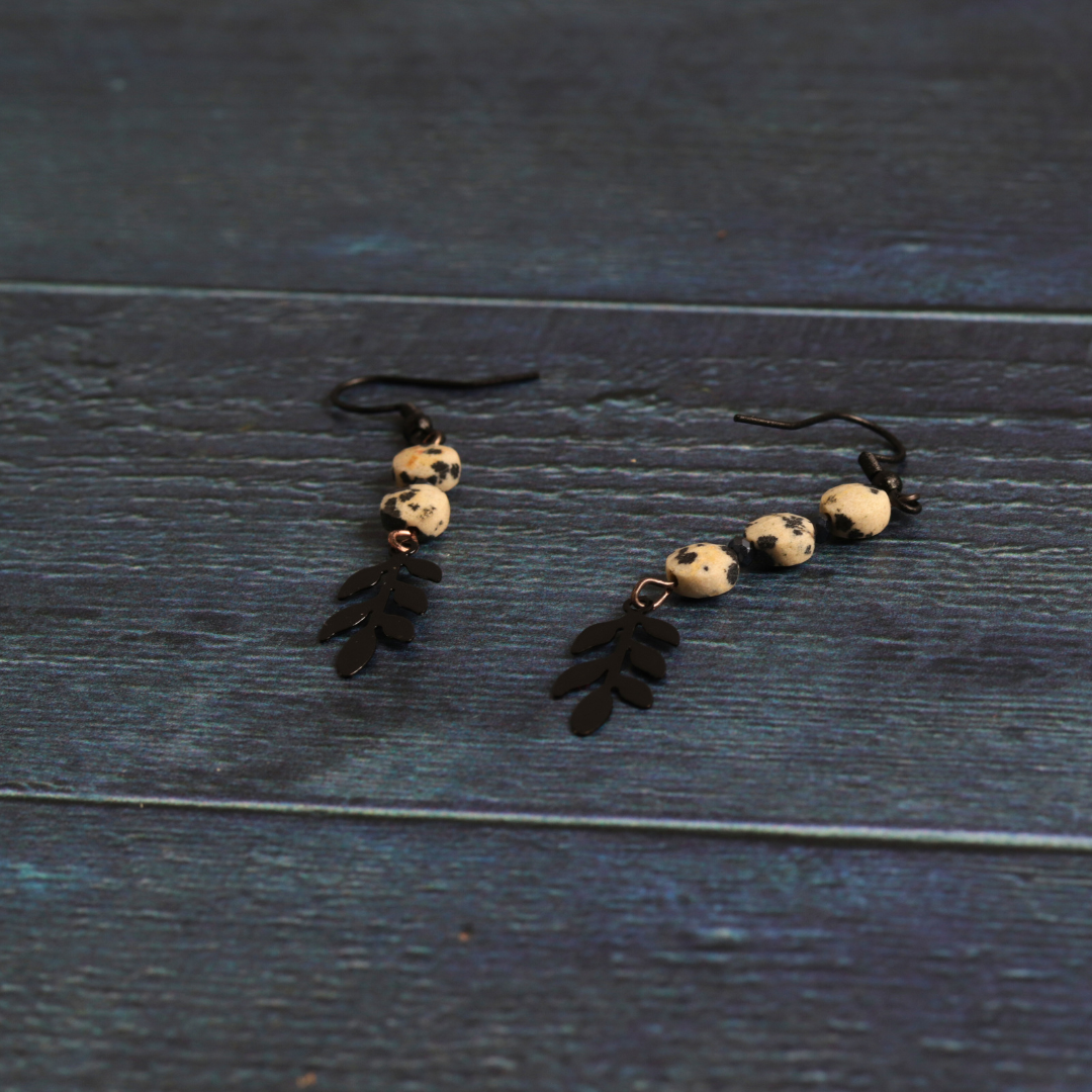 These handmade earrings feature picture jasper stones on a sleek black chain. This elegant combination showcases the natural beauty of the stones. Picture Jasper promotes grounding and creativity, making these earrings a perfect blend of fashion and positive energy.