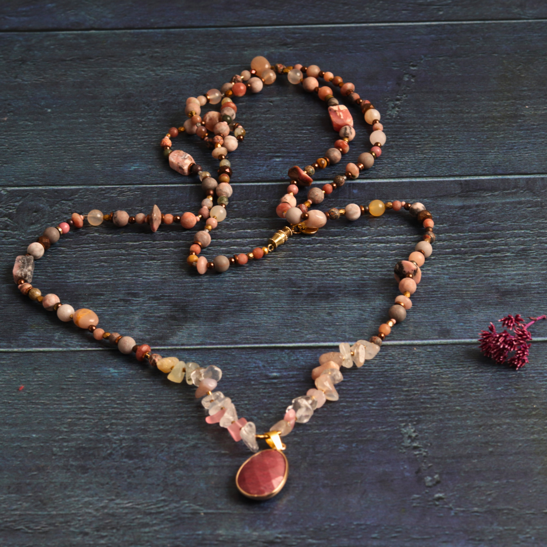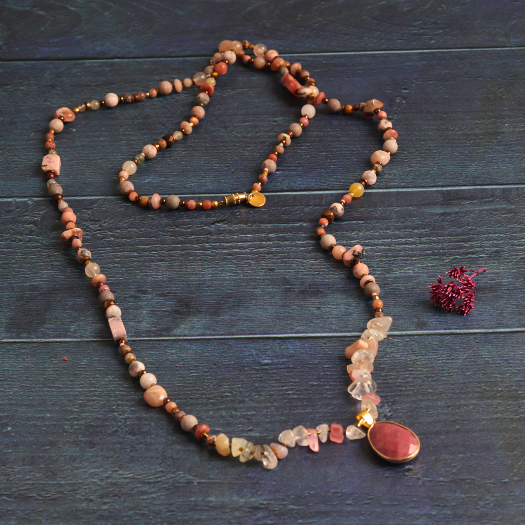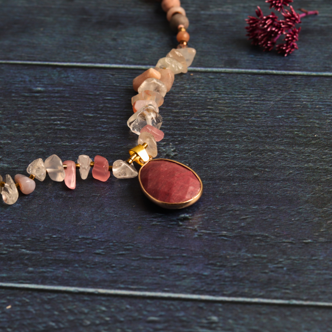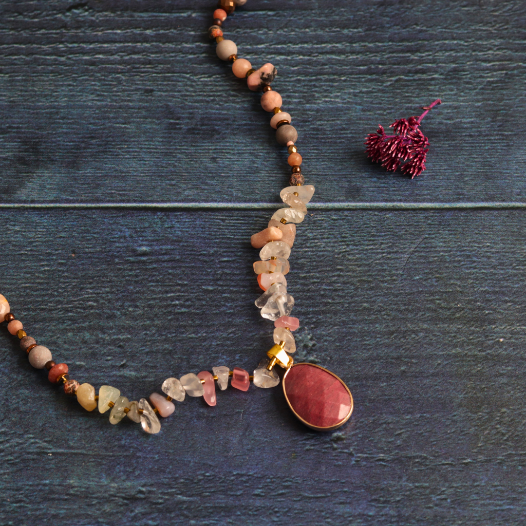 This stunning handmade necklace features an incredible array of stones, including sunstone, zebra jasper, clear quartz, pink opal, rhodonite, cherry blossom agate, and leopard jasper. Each stone is carefully selected and painstakingly crafted, resulting in a vibrant and dynamic piece.