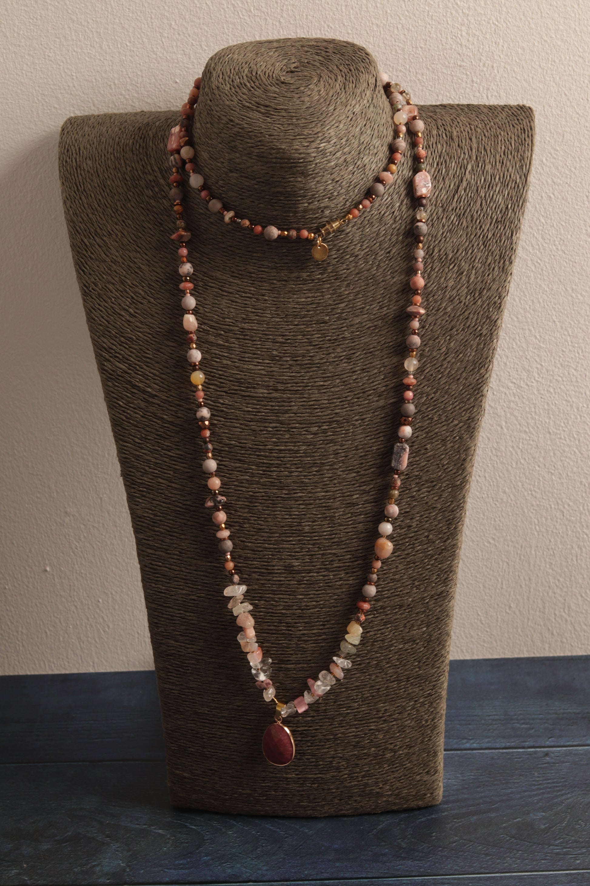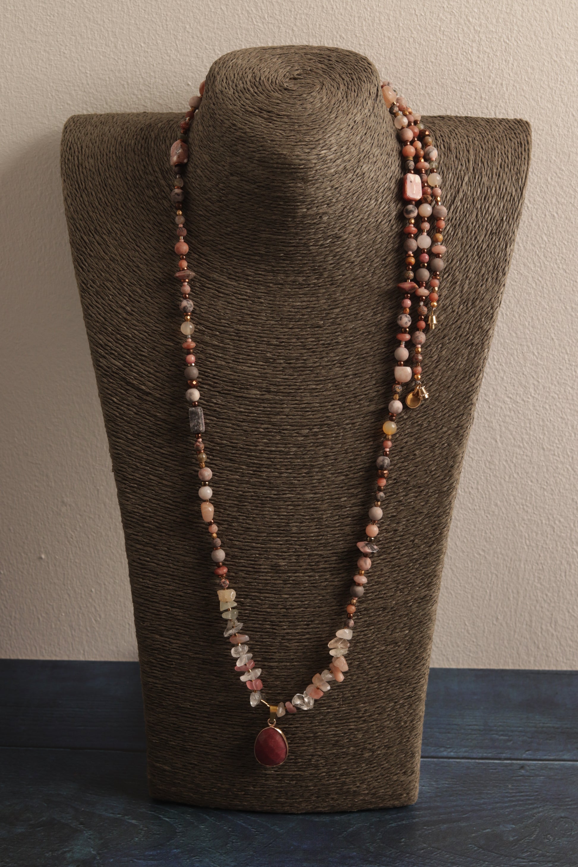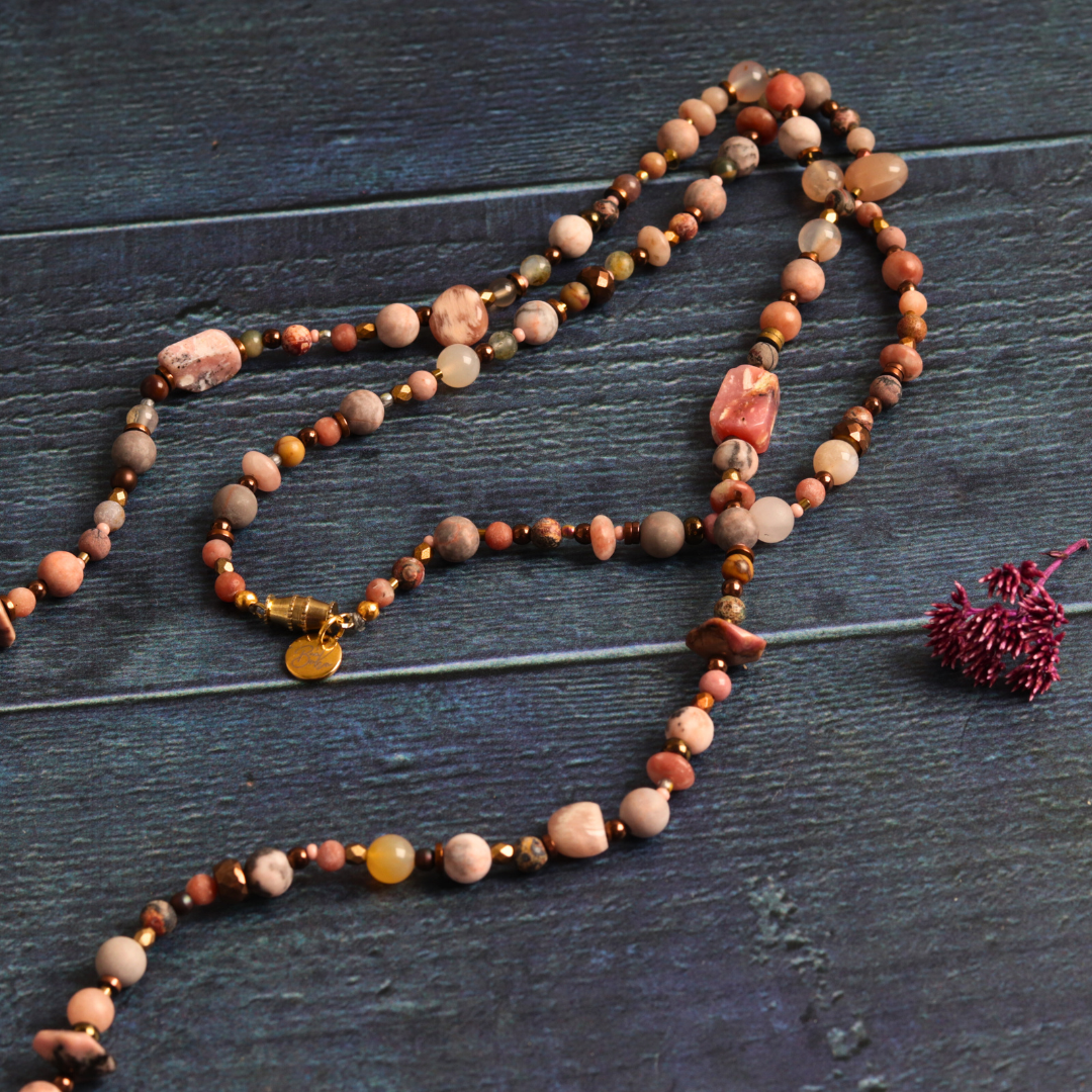 This stunning handmade necklace features an incredible array of stones, including sunstone, zebra jasper, clear quartz, pink opal, rhodonite, cherry blossom agate, and leopard jasper. Each stone is carefully selected and painstakingly crafted, resulting in a vibrant and dynamic piece.