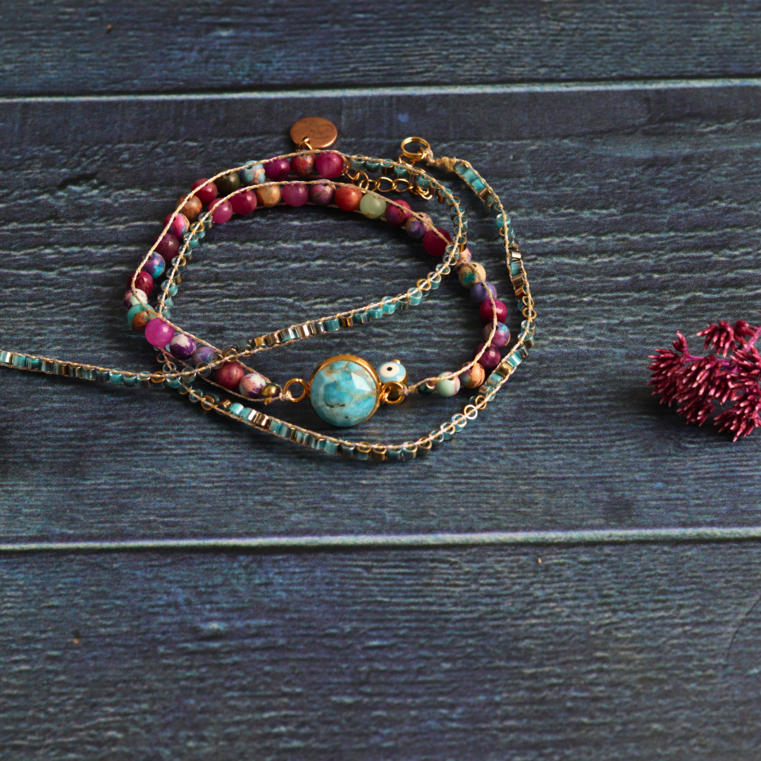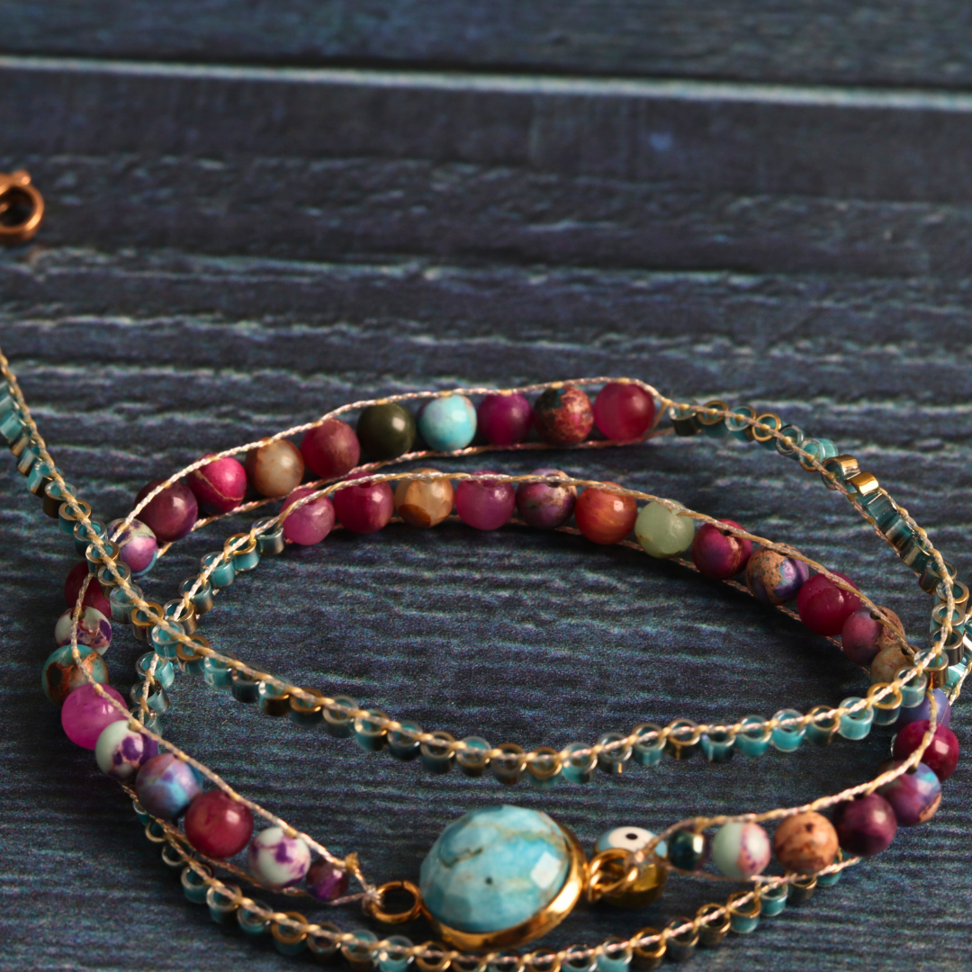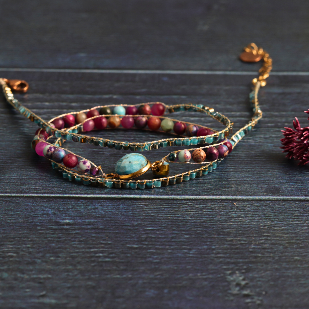 This handmade wrap bracelet features a stunning combination of purple jasper and ocean jasper stones. Purple jasper is known for its calming energy, promoting emotional healing and balance, while ocean jasper is associated with soothing and uplifting vibes, enhancing communication and emotional expression. The unique design allows for versatility and comfort, making it a perfect accessory for any occasion.