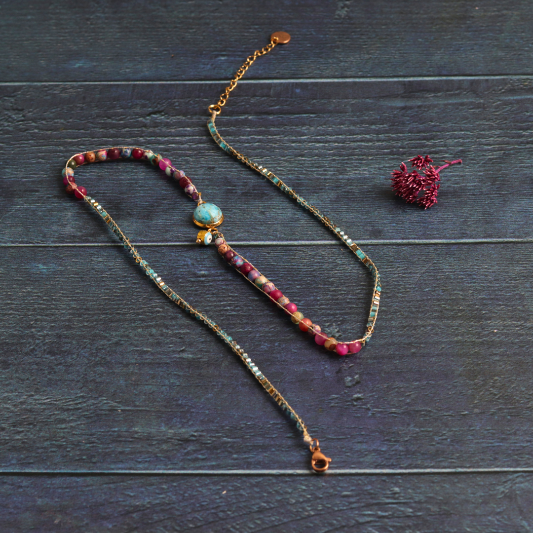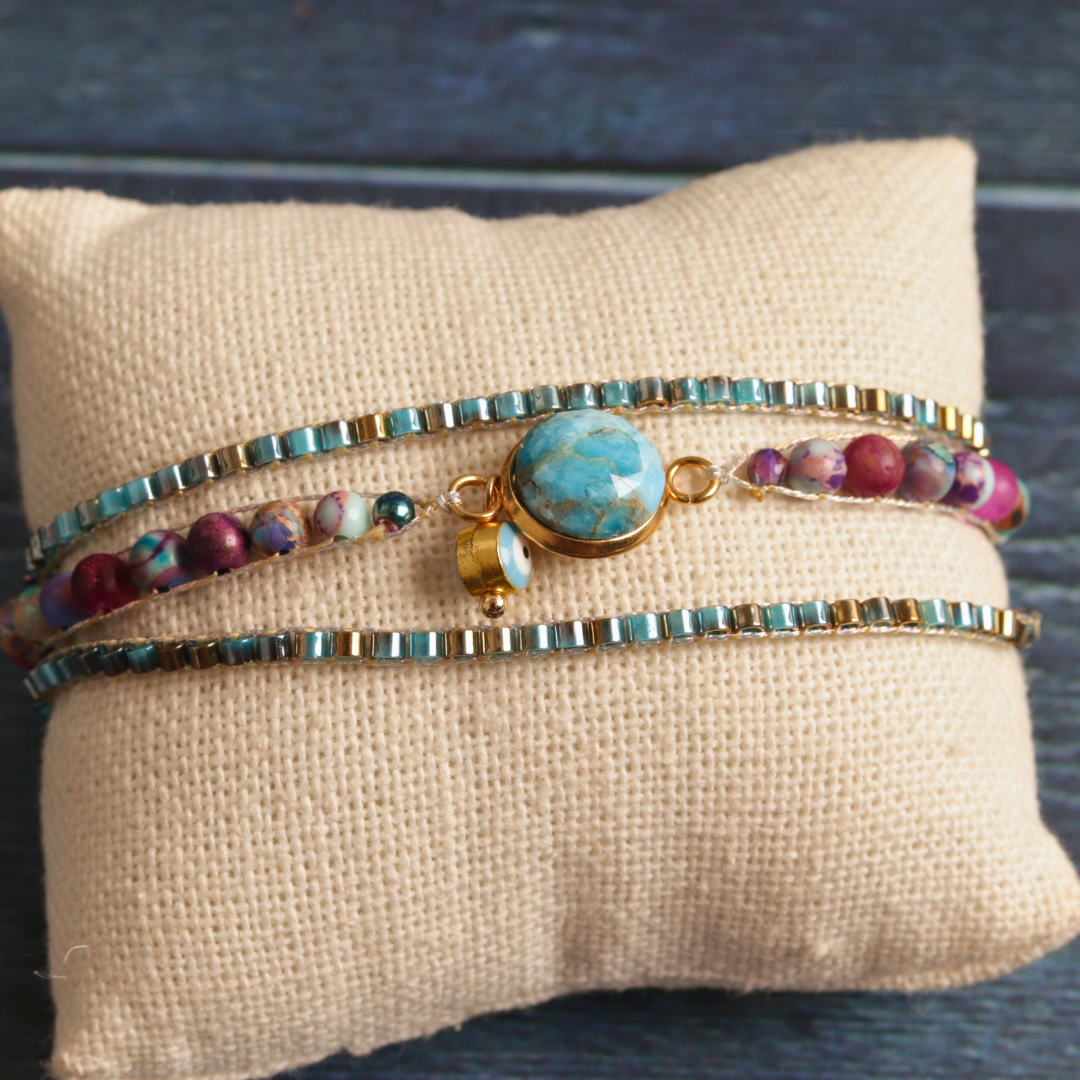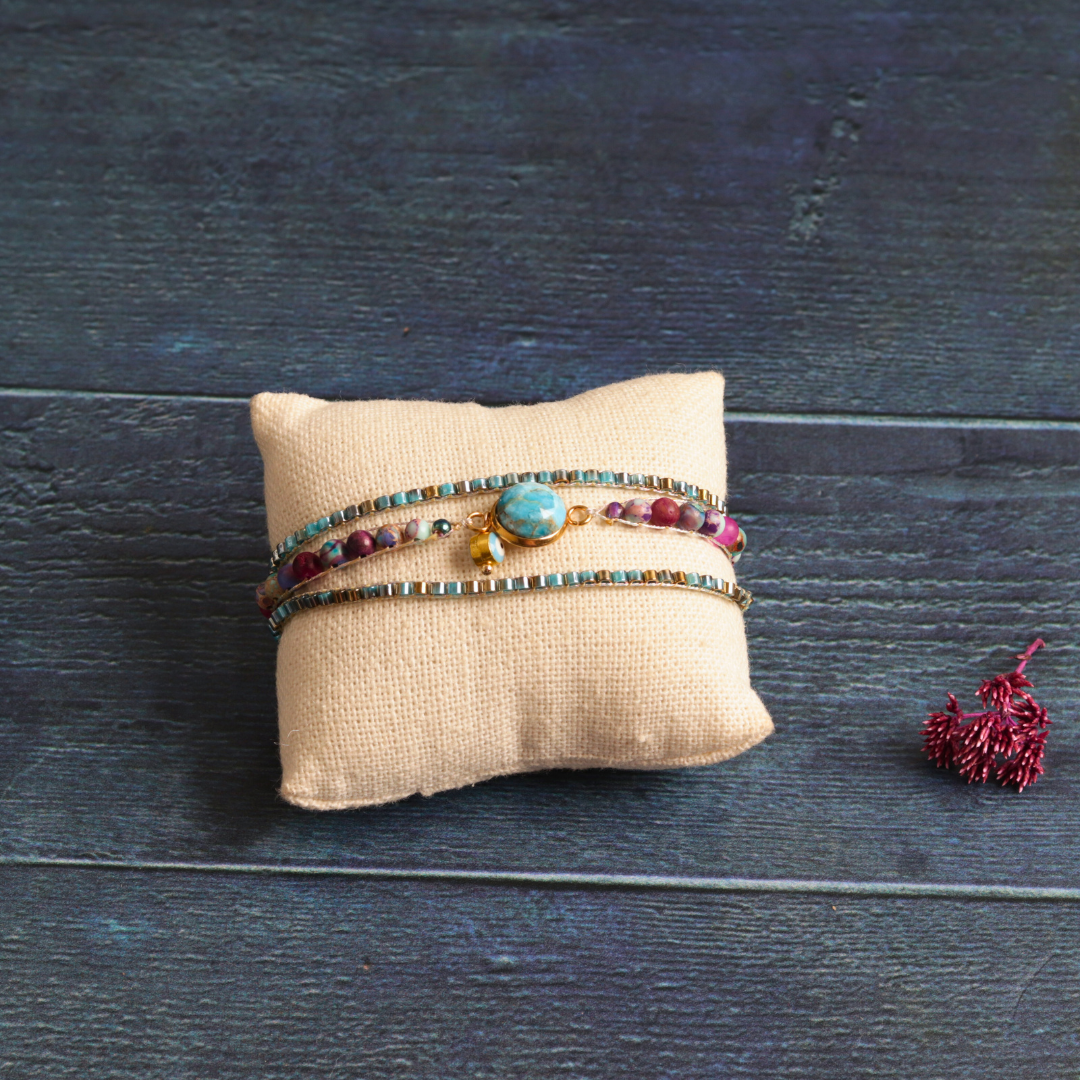 This handmade wrap bracelet features a stunning combination of purple jasper and ocean jasper stones. Purple jasper is known for its calming energy, promoting emotional healing and balance, while ocean jasper is associated with soothing and uplifting vibes, enhancing communication and emotional expression. The unique design allows for versatility and comfort, making it a perfect accessory for any occasion.
