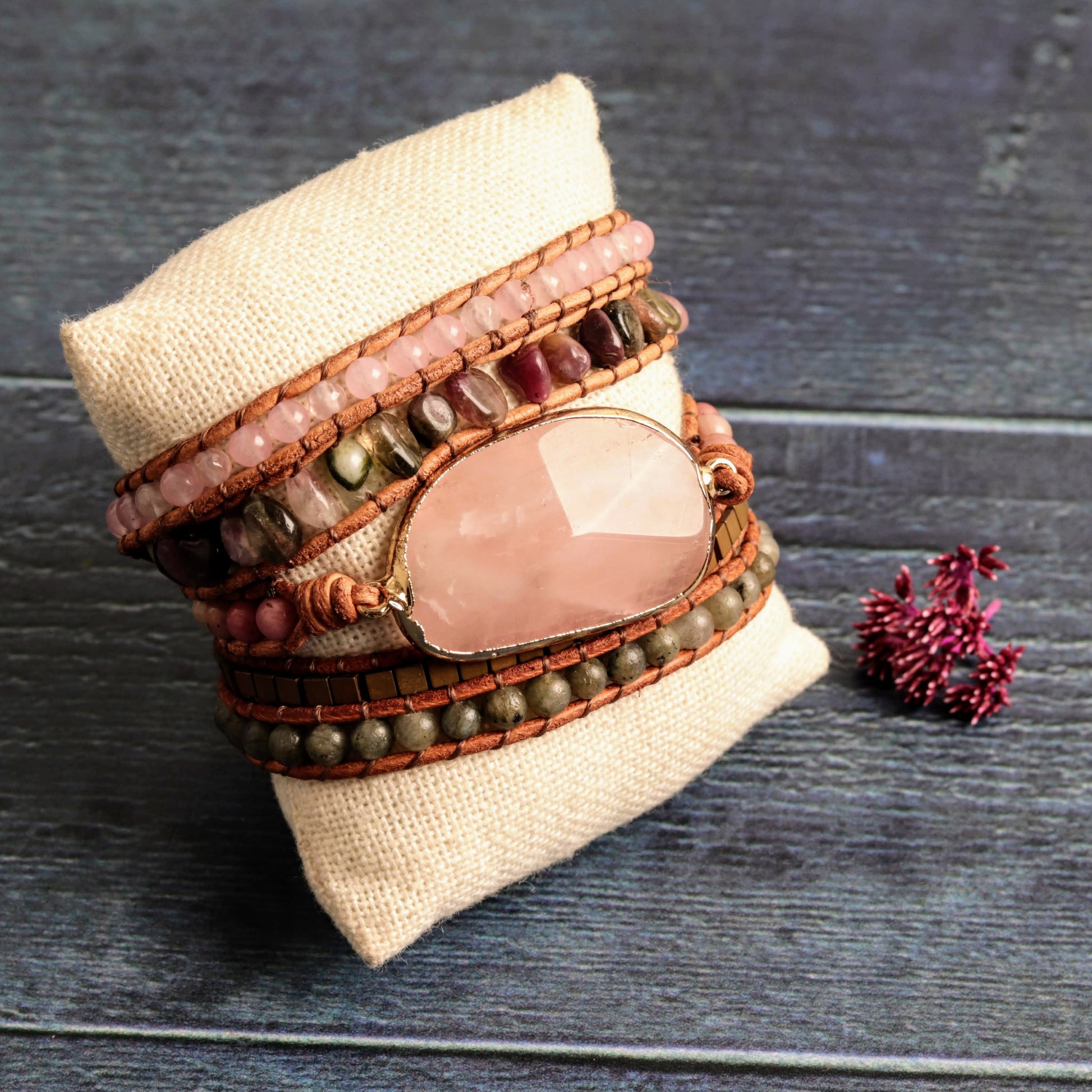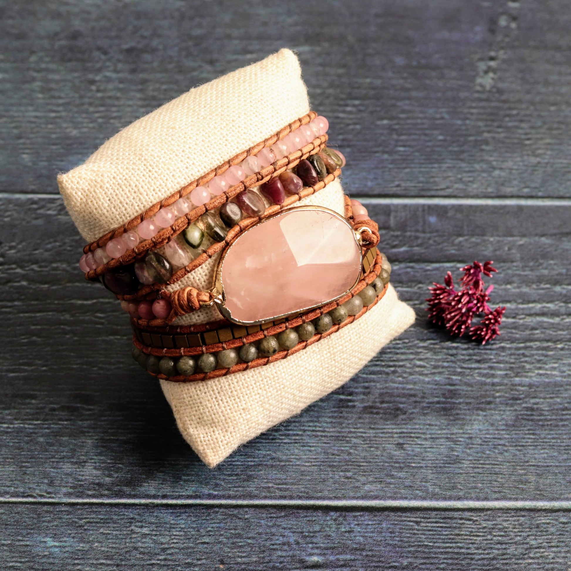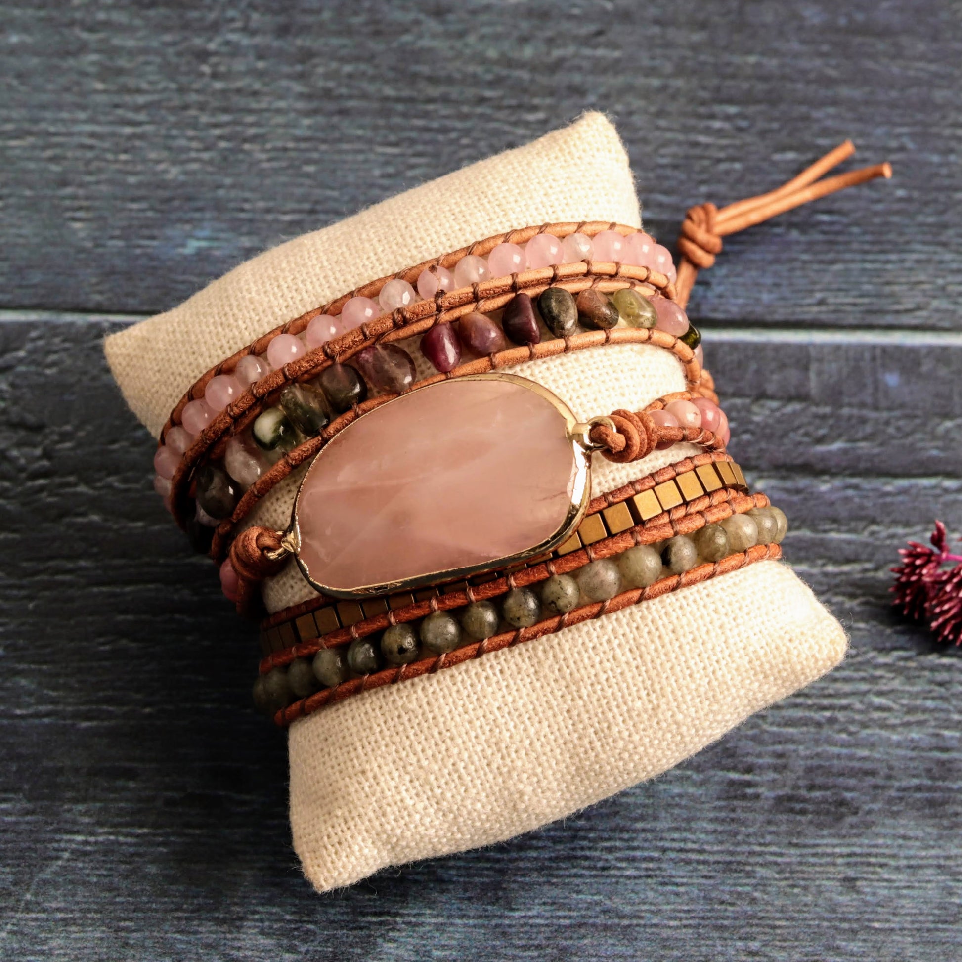 Celebrate harmony with this exquisite wrap bracelet, showcasing a rose quartz centerpiece and a woven fabric chord. Wrapping five times around your wrist, it’s more than just an accessory; it’s a symbol of affection and purpose.