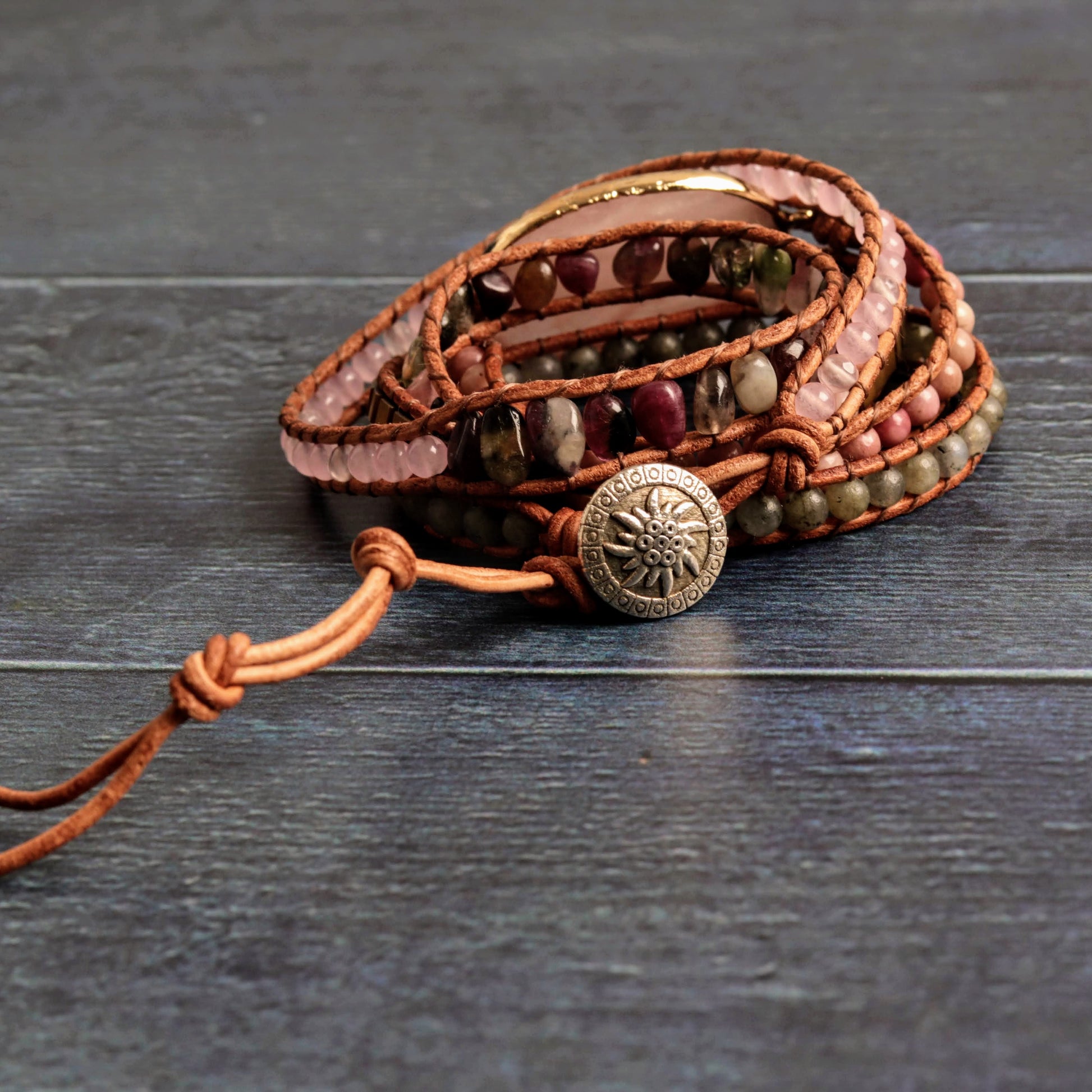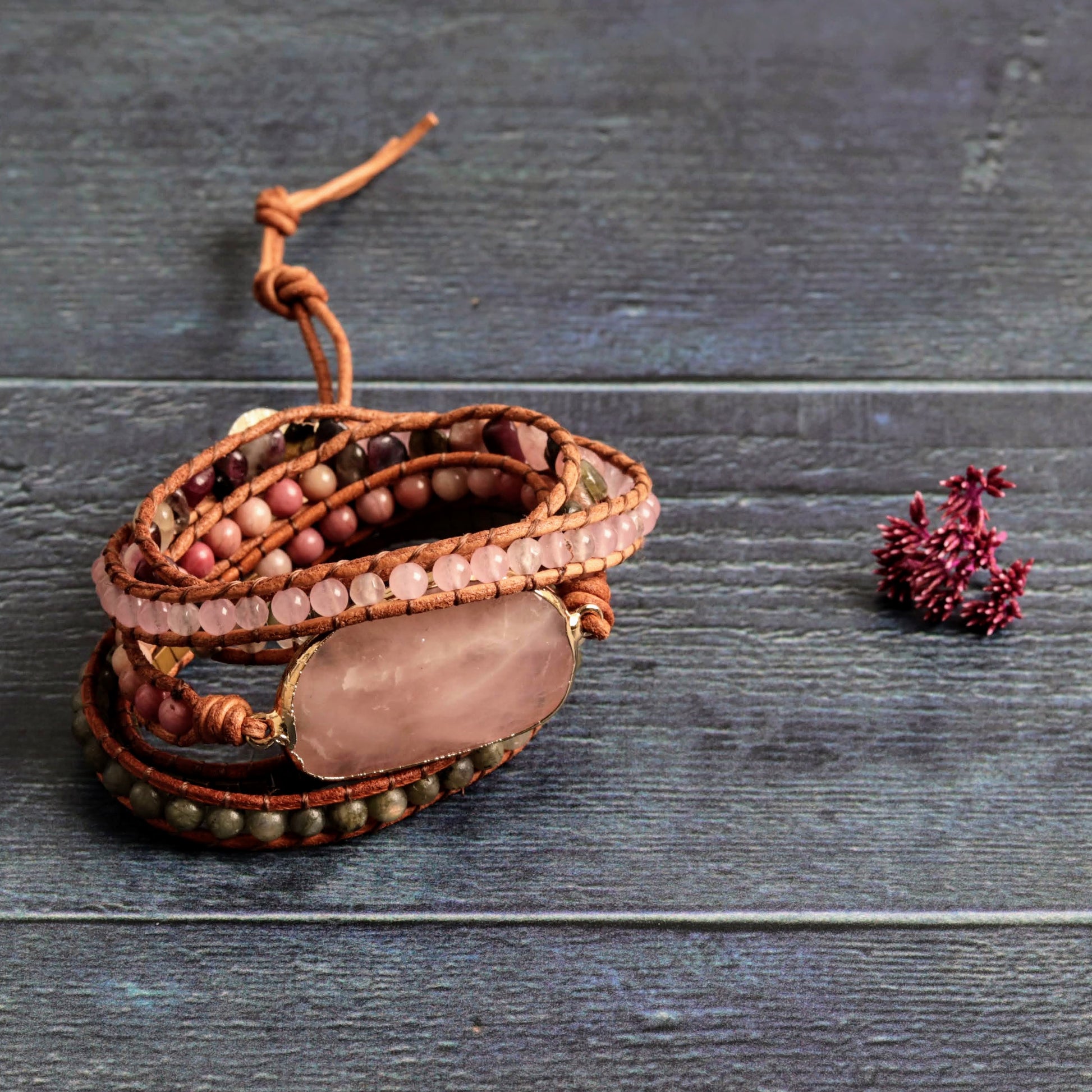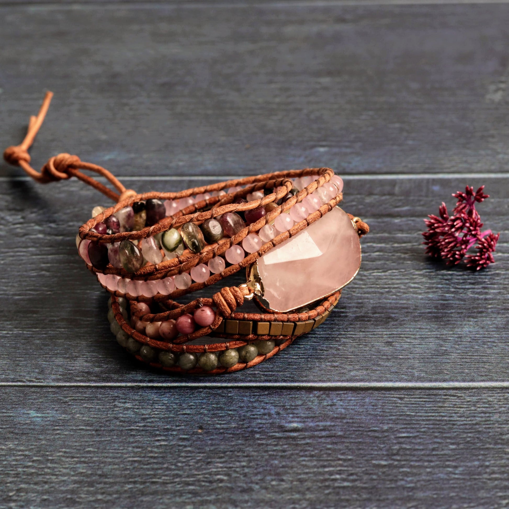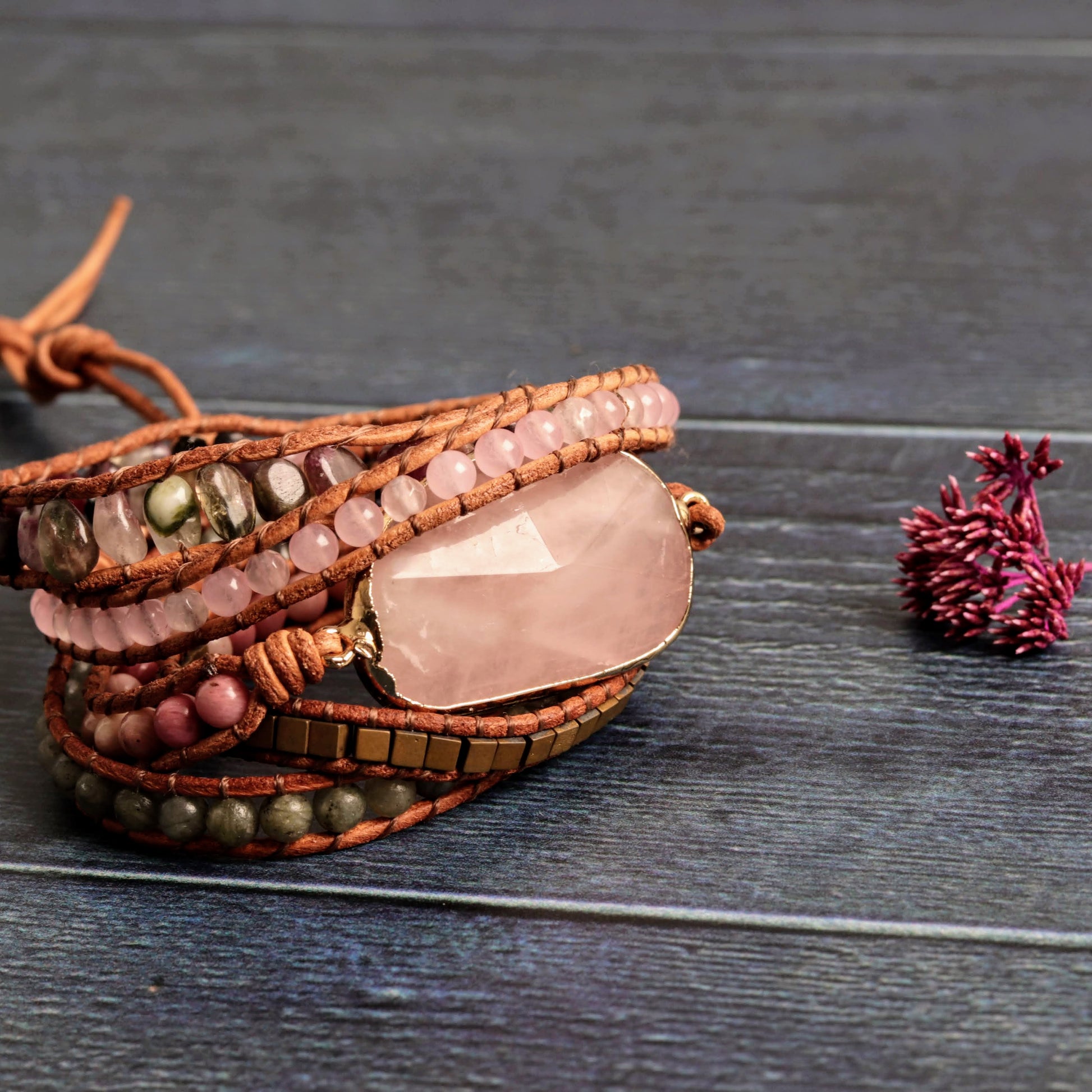 Celebrate harmony with this exquisite wrap bracelet, showcasing a rose quartz centerpiece and a woven fabric chord. Wrapping five times around your wrist, it’s more than just an accessory; it’s a symbol of affection and purpose.